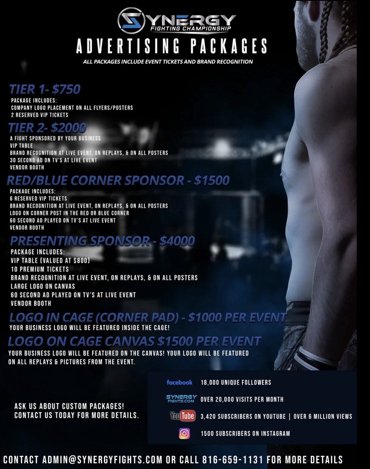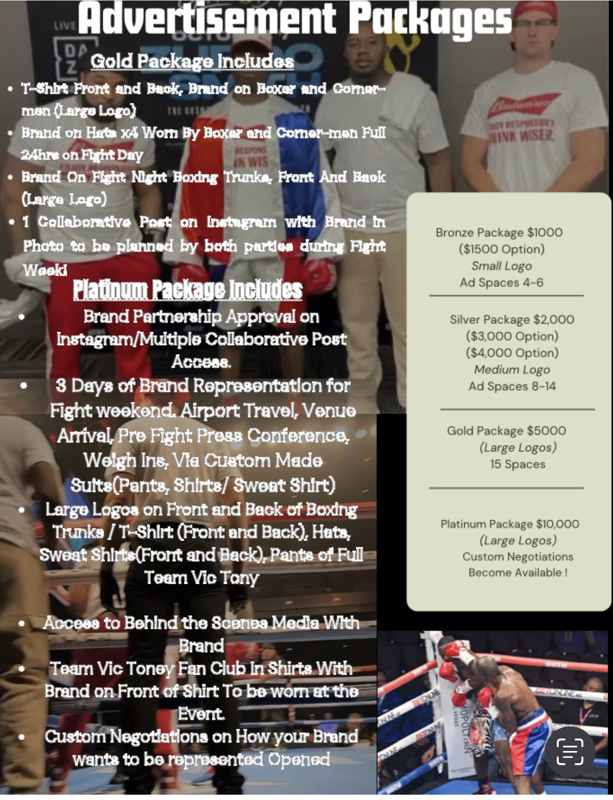 We creates an in depth information page that connects to your original website and YouTube channel. This site is for your promotion to gather more sponsors. The more fighters that participate the more you have for tour sponsorship package offer. Each fighter’s support and promotion fans can now donate directly to the business for your promotion to use for its fighters. rooms, food, equipment etc.