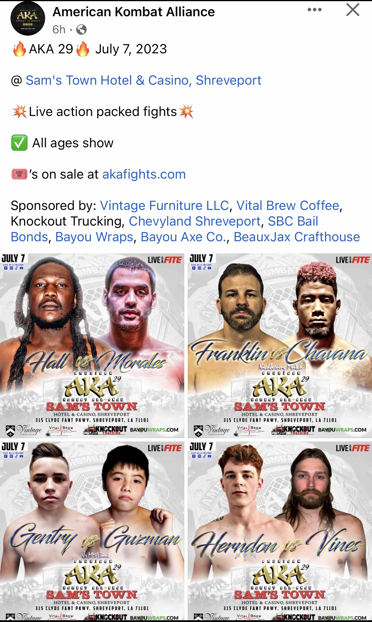 BELOW VIEW OUR NEXT FIGHT CARD, OUR CHAMPIONS AND YOUR FAVORITE FIGHTERS. SUPPORT YOUR FAVORITE FIGHTER BUY PURCHASING FROM OUR SPONSORS OR YOUR FIGHTER INDIVIDUAL SPONSORS.